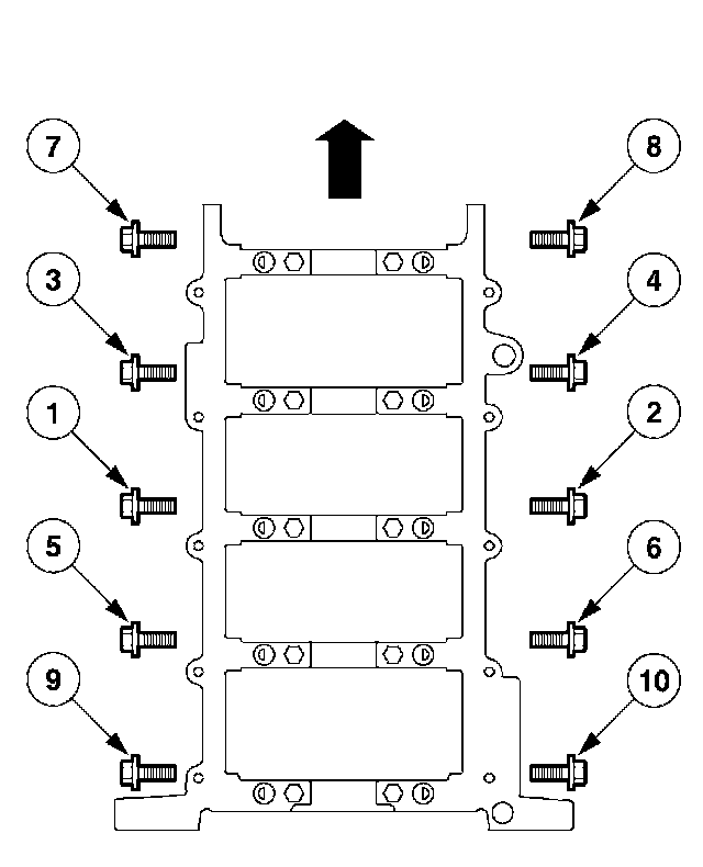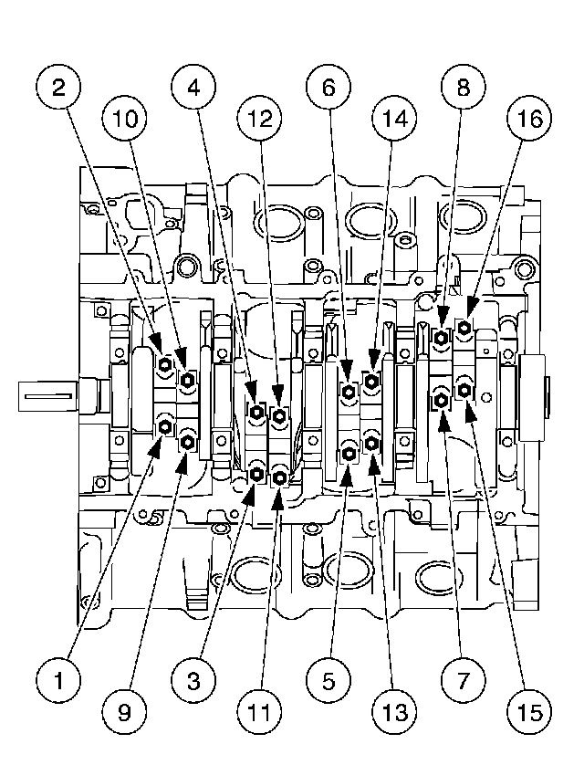 Install the main bearing cap fasteners and tighten in the sequence shown.