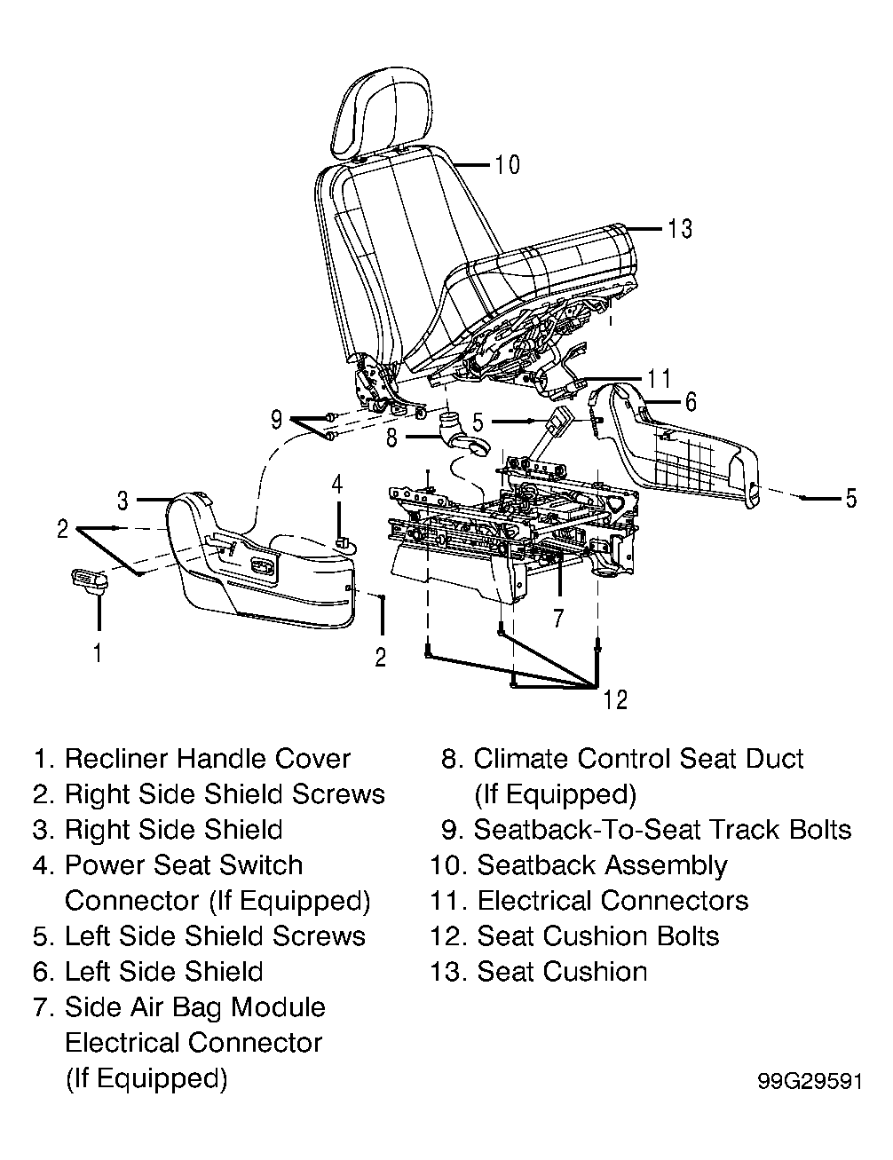 - Remove right front seat. See FRONT SEAT . On models equipped with climate controlled seat, release recliner handle cover tab and remove cover. See Figure . Remove right side shield screws, disconnect power seat switch connector, if equipped and remove side shield. Remove left side shield screws and side shield. On all models, separate side air bag module electrical connector and wire harness pin-type retainers from seat riser and cushion pan.