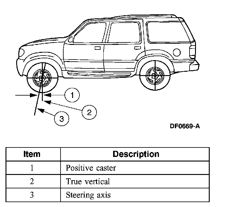 Caster is the deviation from vertical of an imaginary line drawn through the ball joints when viewed from the side. The caster specifications will give the vehicle the best directional stability characteristics when loaded and driven. The caster setting is not related to tire wear.