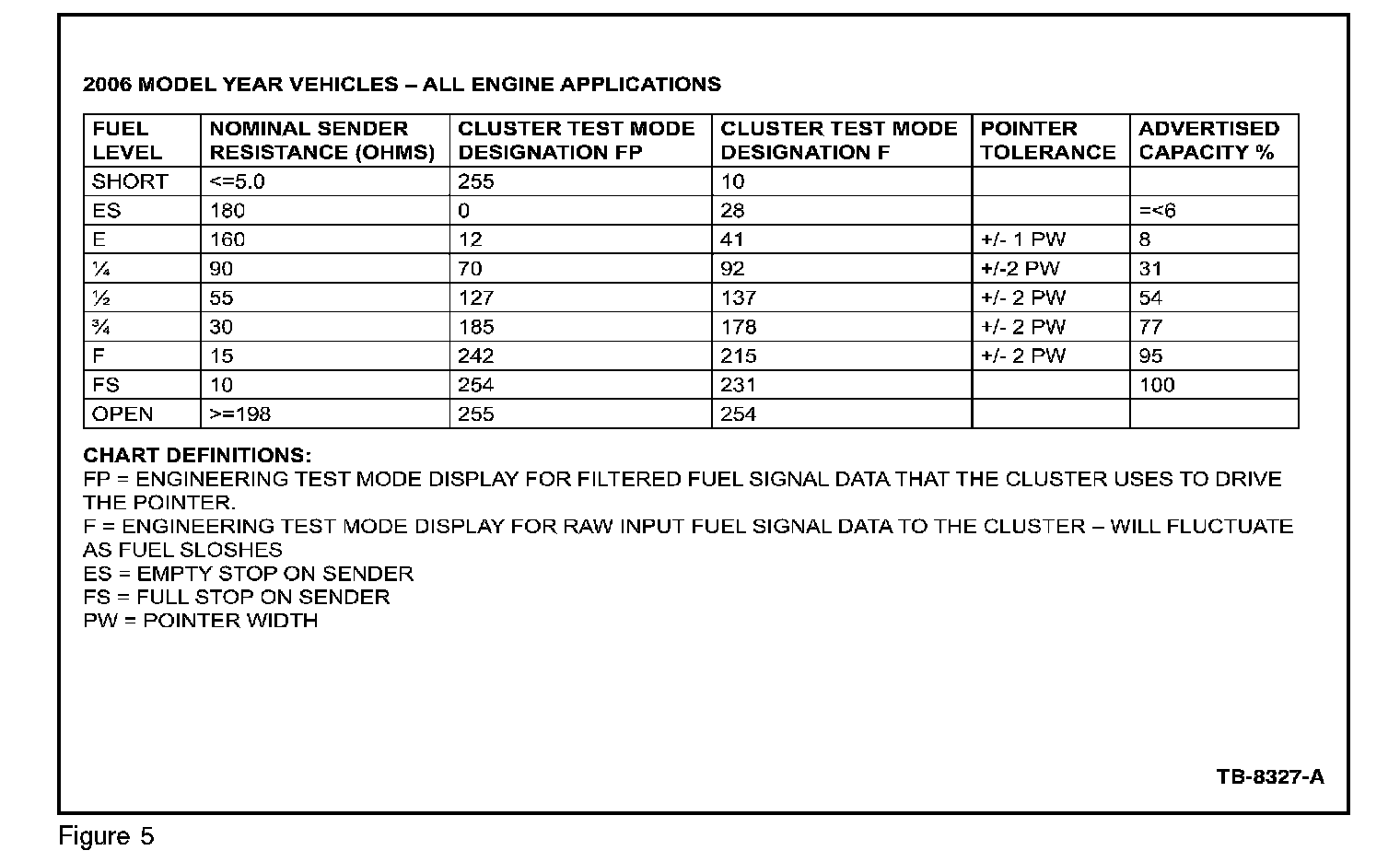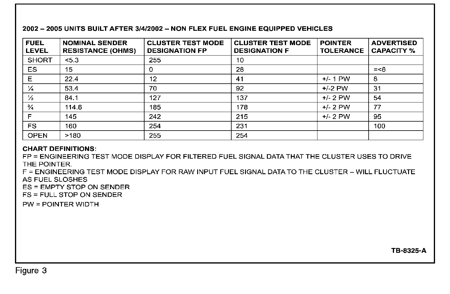 VALUE IN REFERENCE CHARTS ARE NOMINAL TEST VALUES. (EX. A FULL FUEL TANK FILL SHOULD INDICATE FULL, AND THE DISPLAY SHOULD INDICATE A VALUE BETWEEN 242 AND 254)