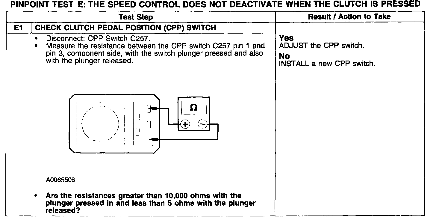 PINPOINT TEST E: THE SPEED CONTROL DOES NOT DEACTIVATE WHEN THE CLUTCH IS PRESSED