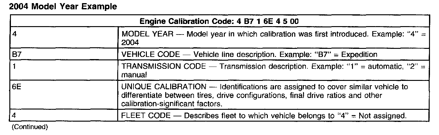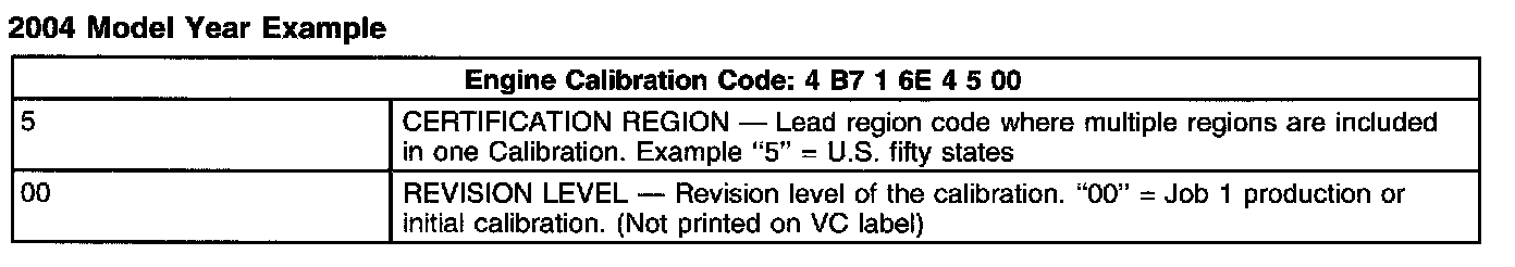 Base Engine Calibration Information also sometimes refer to as the Powertrain Calibration is located in the lower right corner of the Vehicle Certification (VC) Label. Engine calibration information is limited to a maximum of five characters per line (two lines maximum). Calibration information more than five characters long will wrap to the second line of this field. Only the Base Calibration will appear on this label, see (Figure 3) for Car and (Figure 4) for Truck. The Revision Level is no longer printed on the label; however, it can be found in On-Line Automotive Service Information System (OASIS). For more information on Vehicle Certification Label or Engine Calibration, refer to Vehicle/Application and ID.