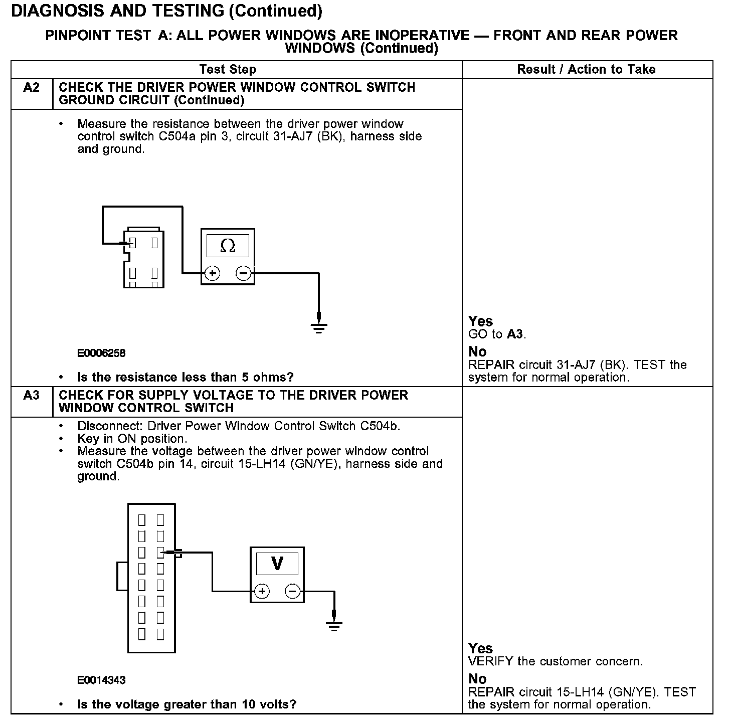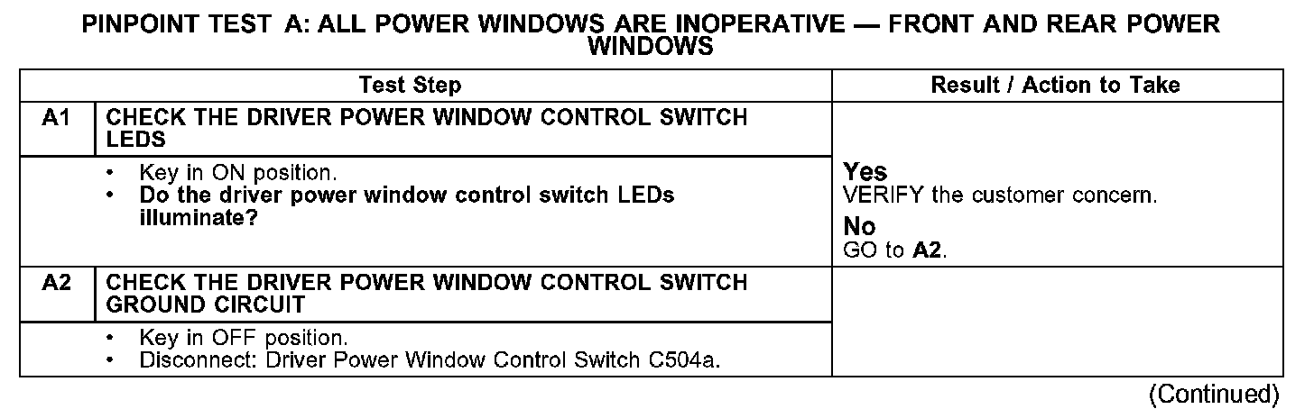 PINPOINT TEST A: ALL POWER WINDOWS ARE INOPERATIVE - FRONT AND REAR POWER WINDOWS