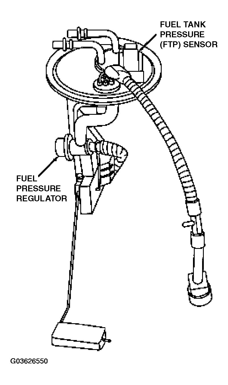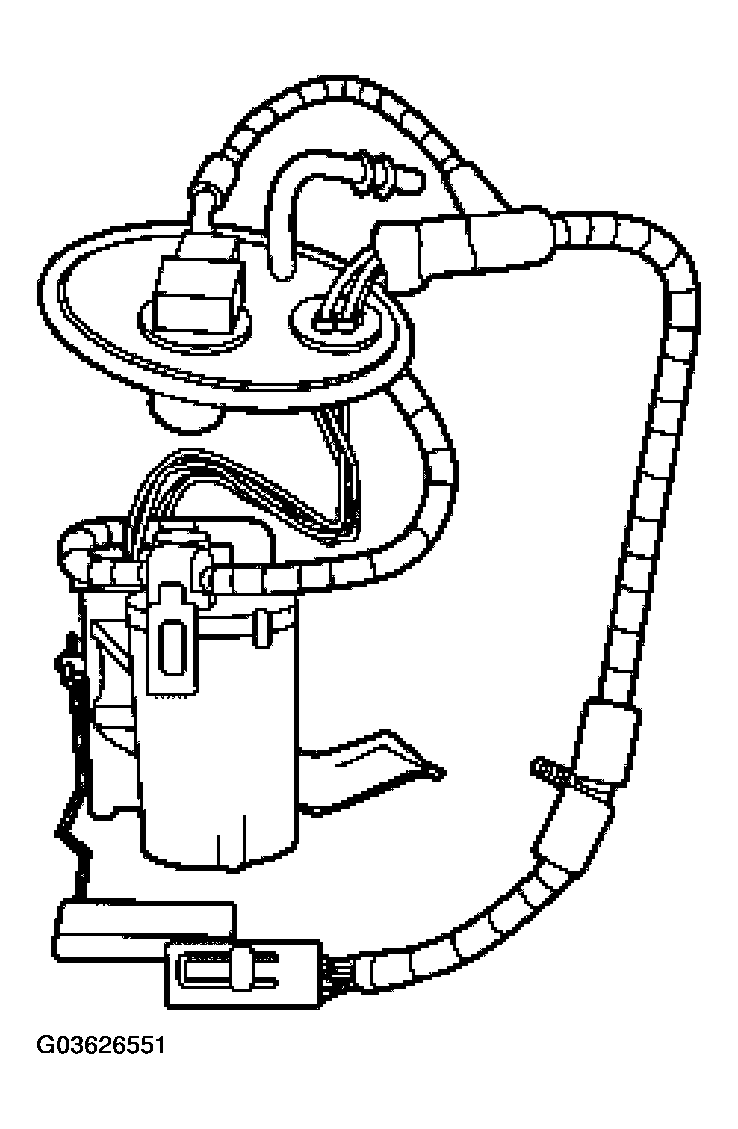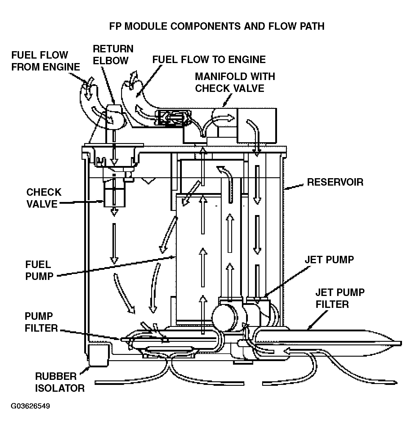 The fuel pump (FP) module (Fig 1, Fig 2 and Fig 3) is a device that contains the fuel pump and sender assembly. The fuel pump is located inside the FP module reservoir and supplies fuel through the FP module manifold to the engine and FP module jet pump. The jet pump continuously refills the reservoir with fuel, and a check valve located in the manifold outlet maintains system pressure when the fuel pump is not energized. A flapper valve located in the bottom of the reservoir allows fuel to enter the reservoir and prime the fuel pump during the initial fill.