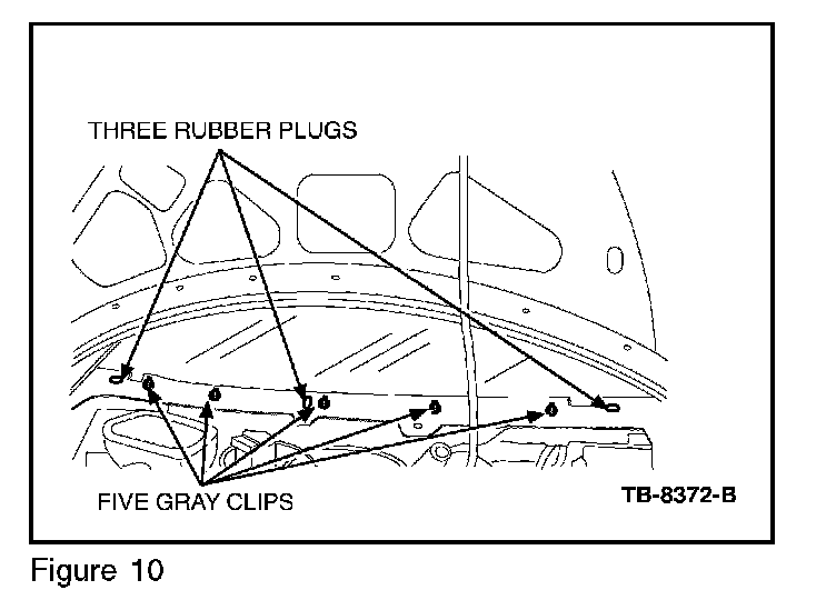 14. Remove and discard the two rubber plugs on the bottom of the cowl sheet metal. (Figure 11)