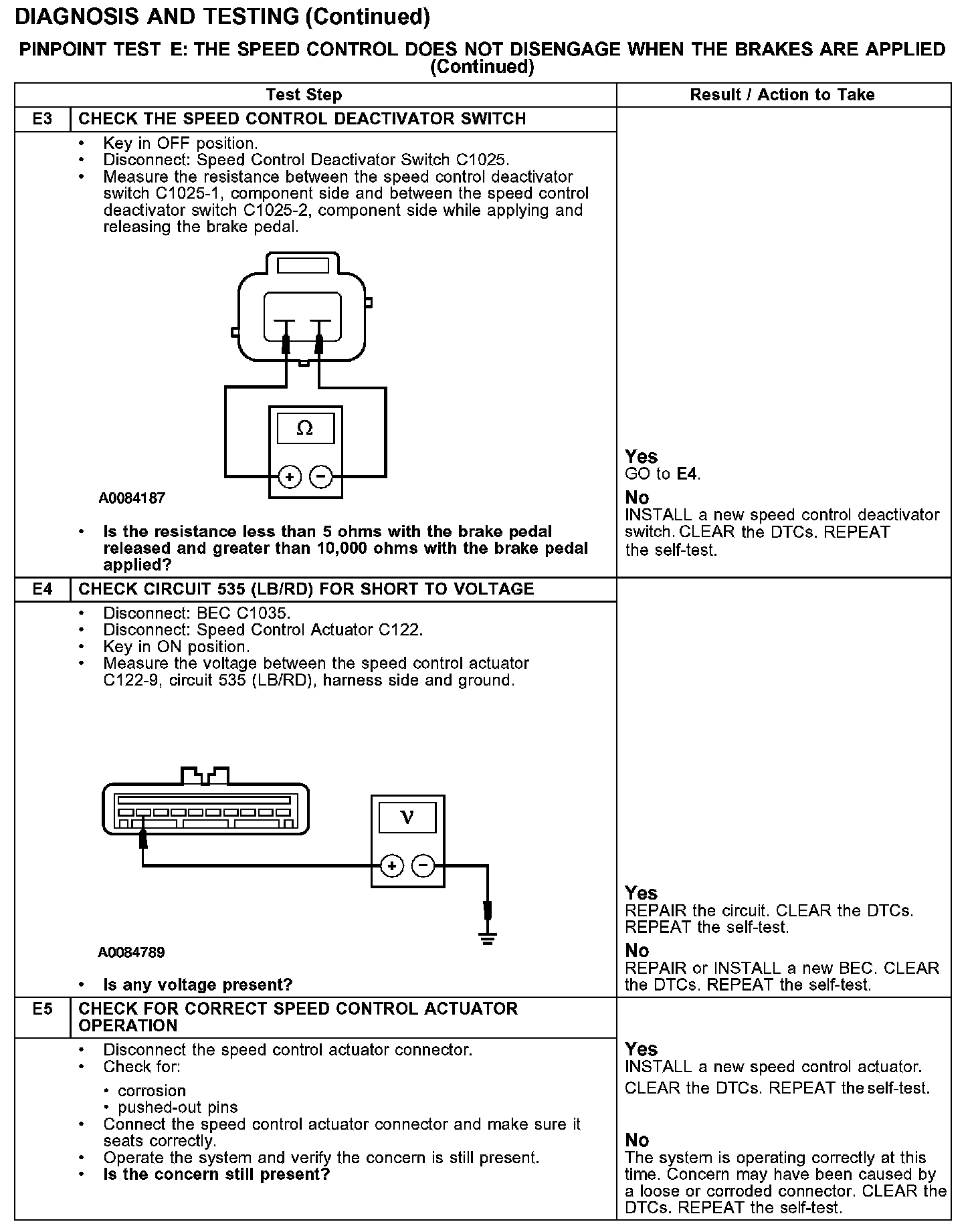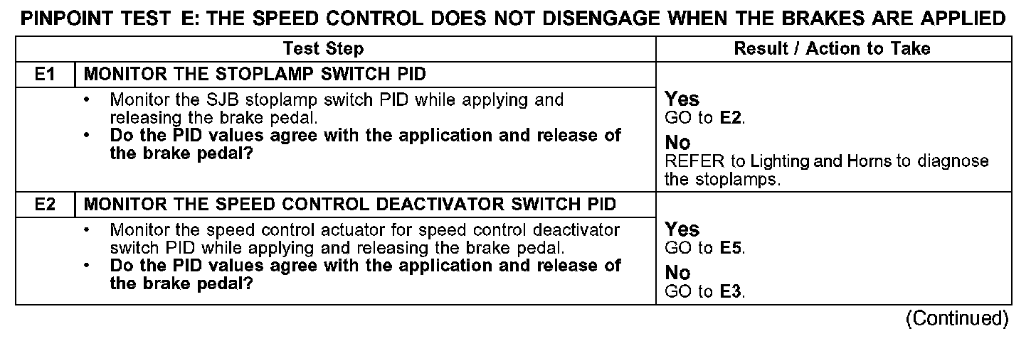 PINPOINT TEST E: THE SPEED CONTROL DOES NOT DISENGAGE WHEN THE BRAKES ARE APPLIEDTest E1-E2: