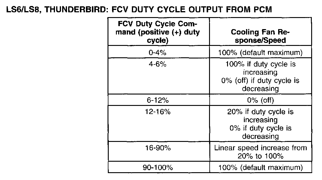LS6/LS8, Thunderbird: FCV Duty Cycle Output From PCM: