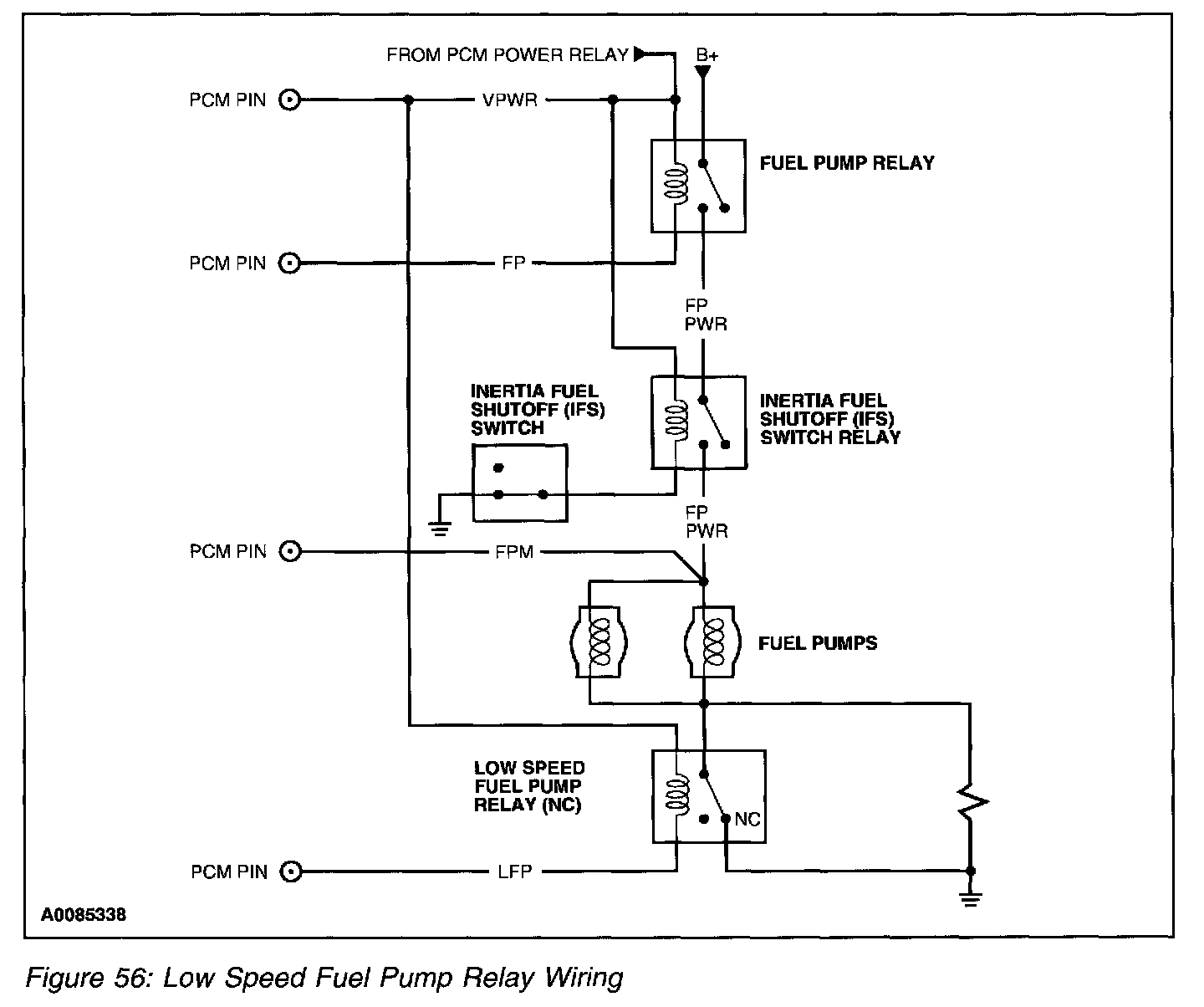 For applications with two speed fuel pumps, a normally closed low speed fuel pump relay (Figure 56) is wired into the fuel pump ground circuit. With the low speed fuel pump relay contacts in the normally closed position, there is no extra resistance in the ground circuit for high speed operation. For low speed fuel pump operation, the PCM will ground the Low Fuel Pump (LFP) circuit, which opens the relay contacts. With the relay contacts open, the fuel pump ground circuit now passes through a resistor that is wired into the circuit.