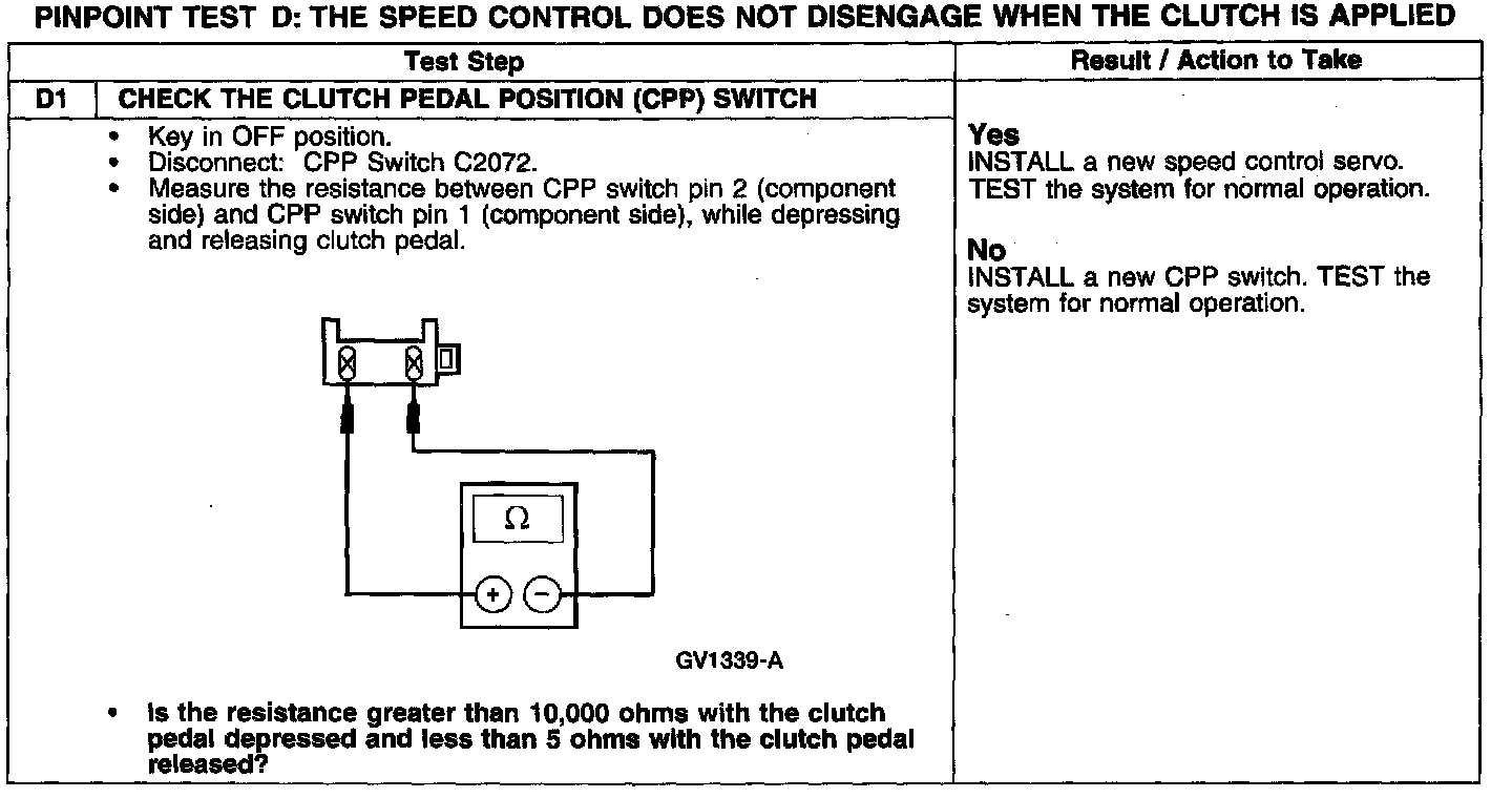 PINPOINT TEST D: THE SPEED CONTROL DOES NOT DISENGAGE WHEN THE CLUTCH IS APPLIED