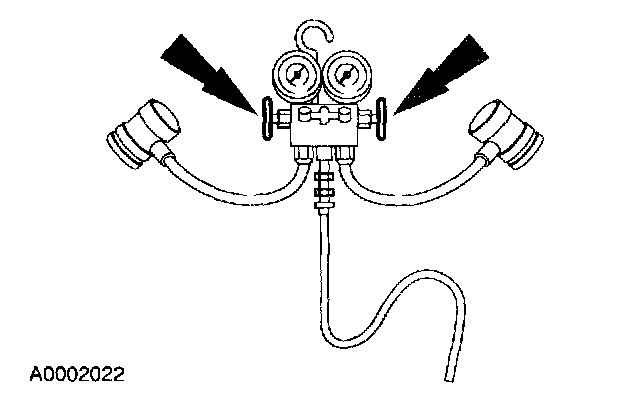 1. Turn both valves on the R-134a Manifold Gauge Set clockwise to close the low- and high-pressure hoses to the center manifold and center hose.