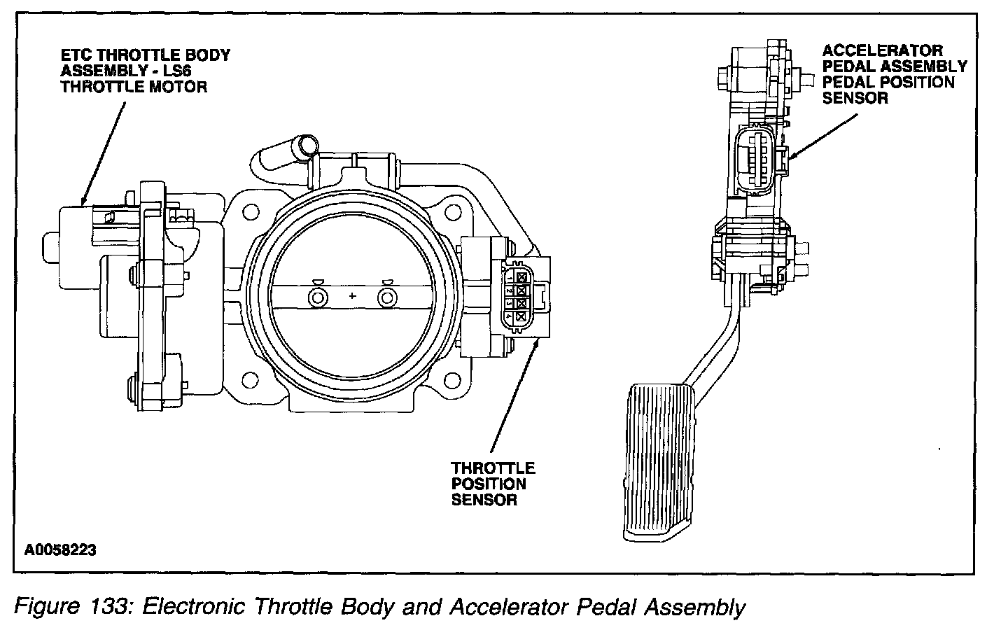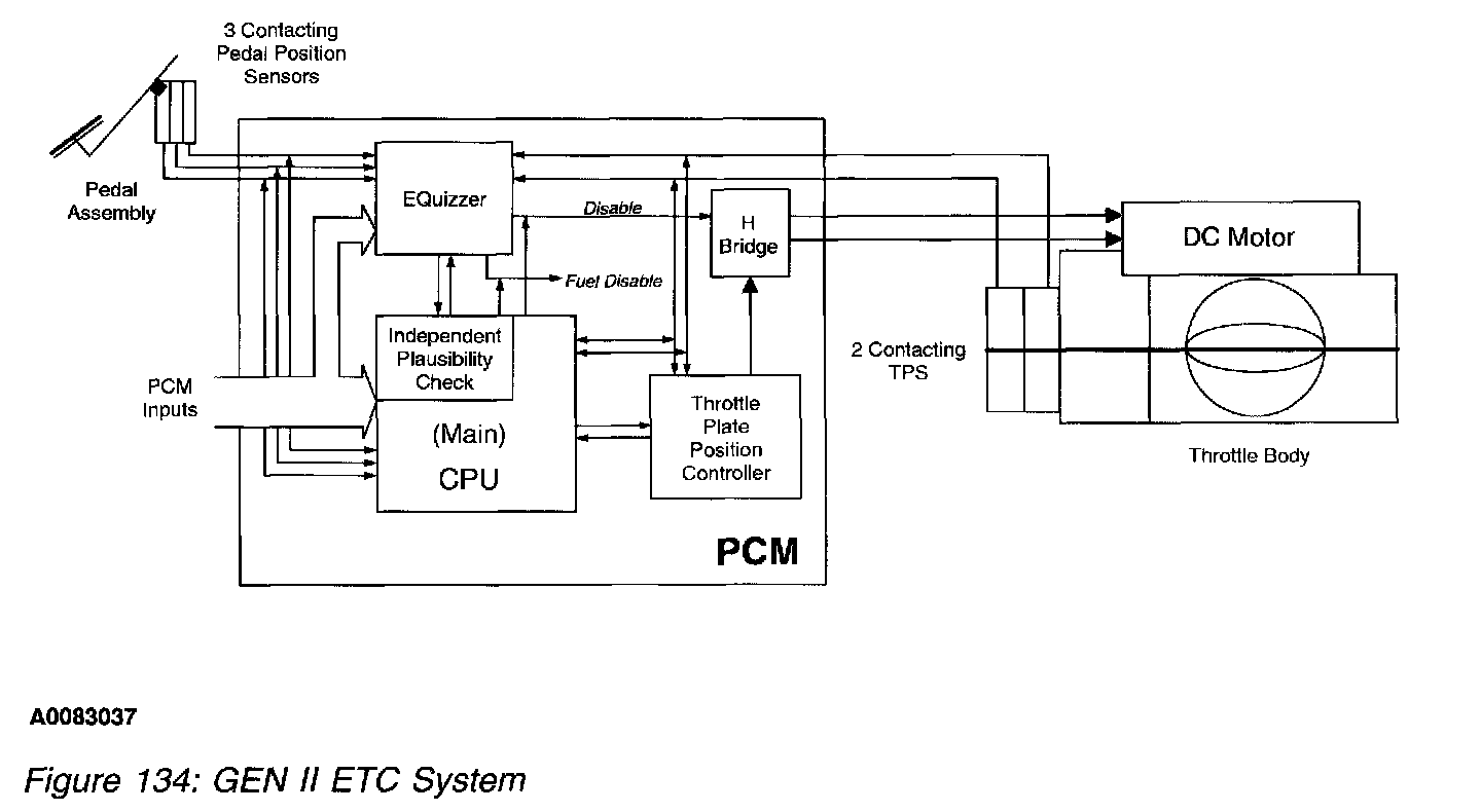 The Generation II (Gen II) Torque Based Electronic Throttle Control (ETC) is a hardware and software strategy that delivers a transmission output shaft torque (via throttle angle) based on driver demand (pedal position). It utilizes an electronic throttle body, the PCM and a accelerator pedal assembly to control throttle opening and engine torque. The ETC system basically replaces the standard cable operated accelerator pedal, idle air control (IAC) motor, 3-wire throttle position sensor (TPS) and mechanical throttle body