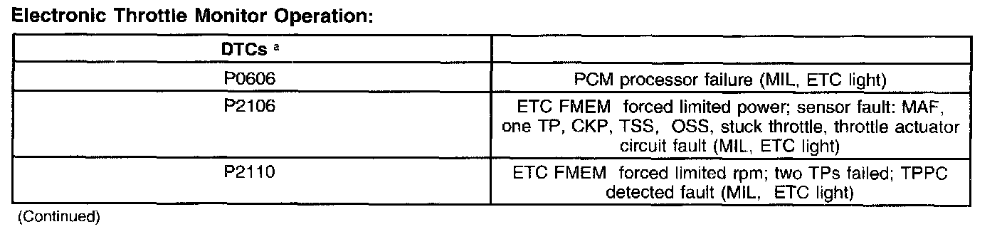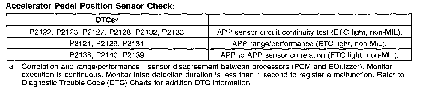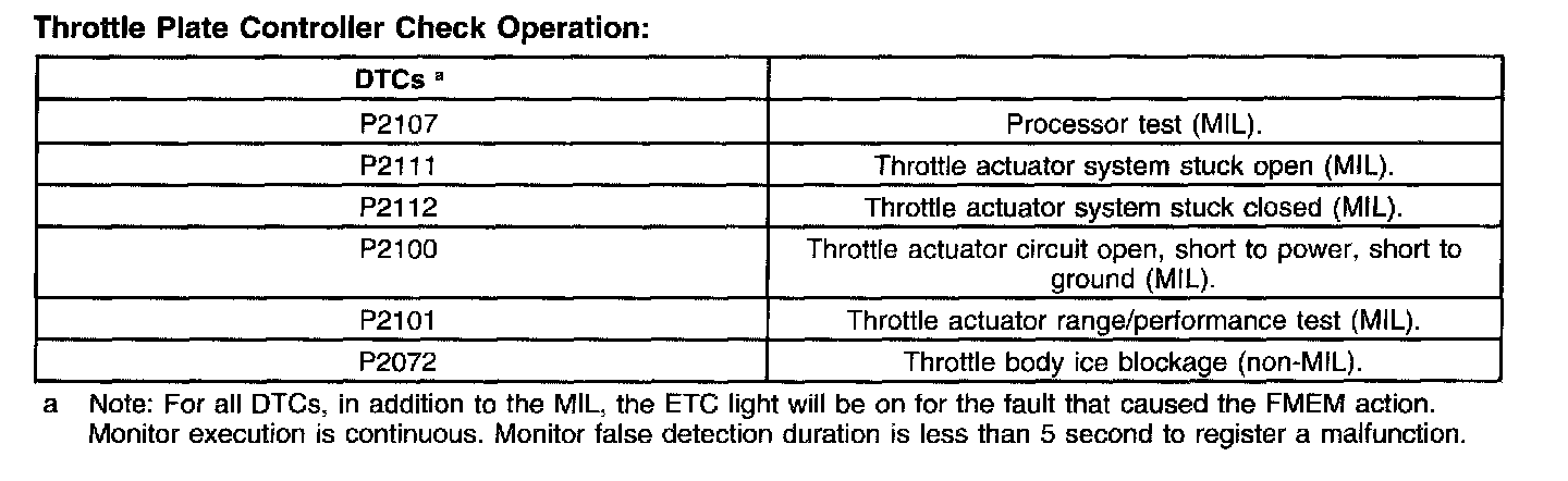 It should be noted that the ETC system includes a wrench light on the instrument cluster that illuminates when a fault is detected. Faults are also accompanied by DTCS and the "Check Engine Soon" light.
