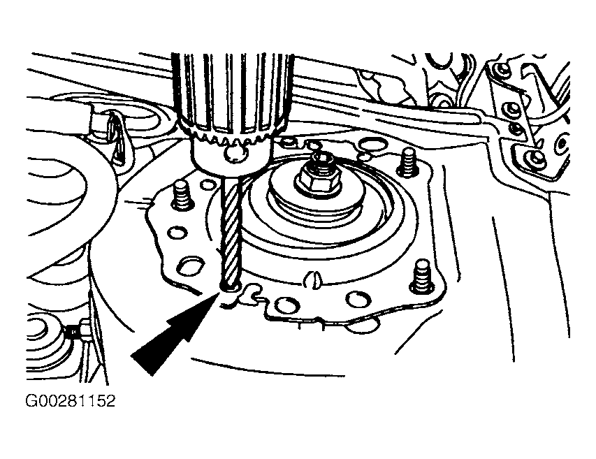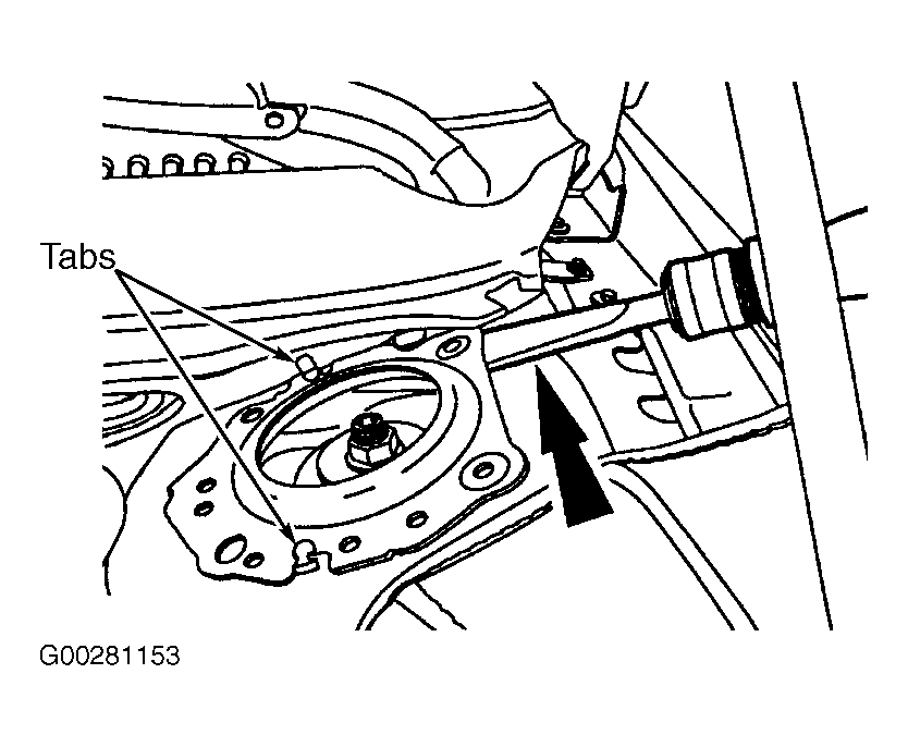 - Position the vehicle on a hoist. Raise the vehicle enough to push the strut downward. The strut studs must be below the alignment plate. Using a screwdriver, carefully pry the two tabs up and off the alignment plate. See Fig 3 .
