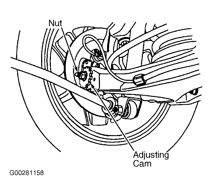 Loosen the nut. See Fig 1 . Rotate the adjusting cam to achieve the specified toe setting. See WHEEL ALIGNMENT SPECIFICATIONS . Make sure that the toe settings are not disturbed while tightening the nut. While holding the adjusting cam, tighten the nut to specification. See TORQUE SPECIFICATIONS .