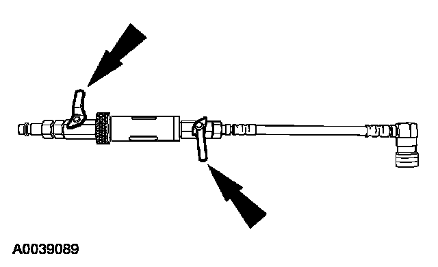 5. Install the dye/lubricant injector between the low-side service gauge port valve and the refrigerant service station or manifold gauge set.