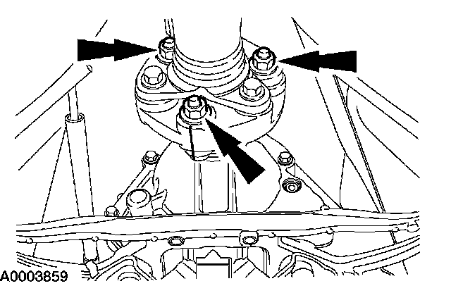 Index-mark the front driveshaft pinion flange. Remove the three nuts, washers and bolts.