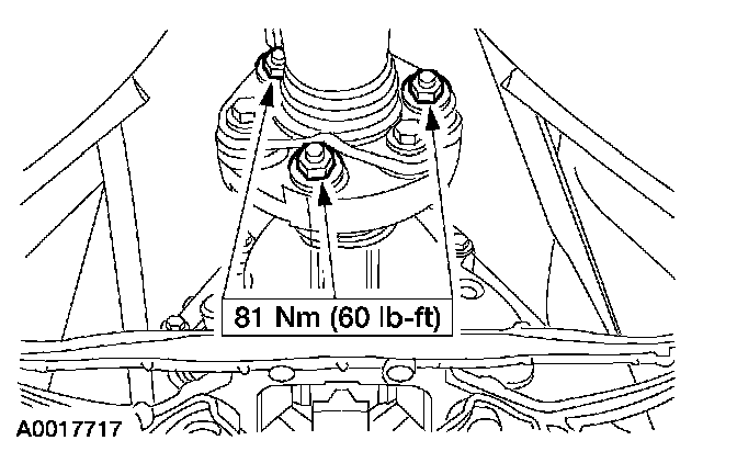 2. CAUTION: Install the bolts, washers, and nuts in their original position or driveshaft imbalance can occur. Install the driveshaft flex coupling bolts with the head of the bolt seated against the flange, and the nuts seated against the flex coupling.