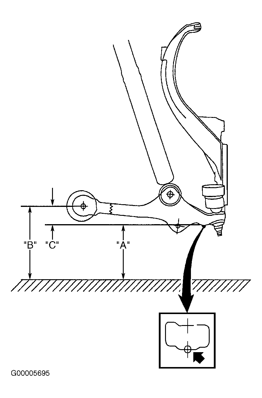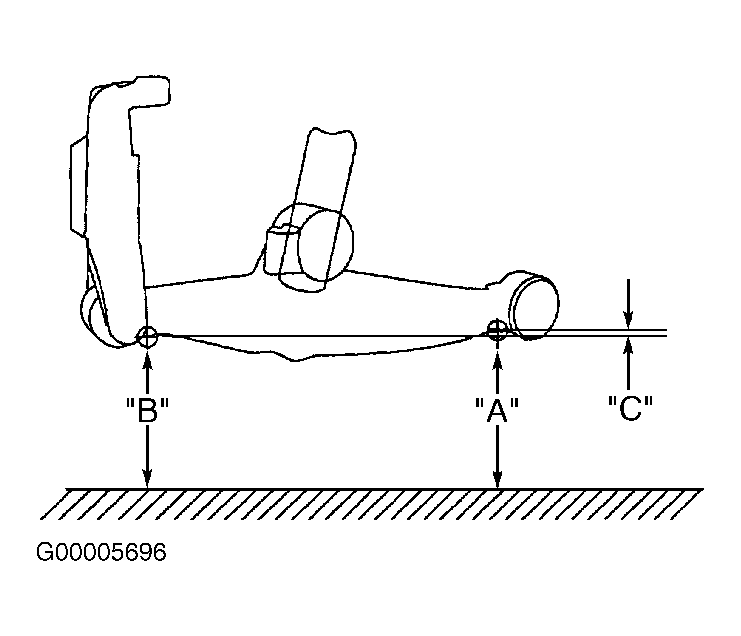 To calculate ride height, measure and record dimension "C". See Fig 1 and Fig 2 . See RIDE HEIGHT SPECIFICATIONS  table. If ride height does not meet specification, and no unusual load is present, check for damaged components or non-standard replacement suspension components.