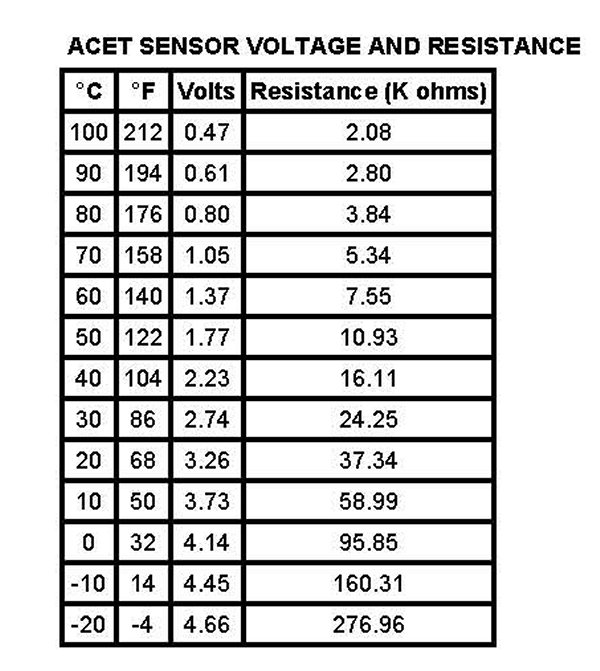 The ACET sensor monitors the evaporator air discharge temperature. The ACET sensor is a thermistor device in which resistance changes with temperature. The ACET sensor is used to more accurately control A/C clutch cycling, improve defrost/demist performance and reduce A/C clutch cycling. The electrical resistance of a thermistor decreases as the temperature increases, and the resistance increases as the temperature decreases. The PCM sources a low current 5 volts on the ACET circuit. With SIG RTN also connected to the ACET sensor, the varying resistance affects the voltage drop across the sensor terminals. As the A/C evaporator air temperature changes, the varying resistance of the ACET sensor changes the voltage the PCM detects.
