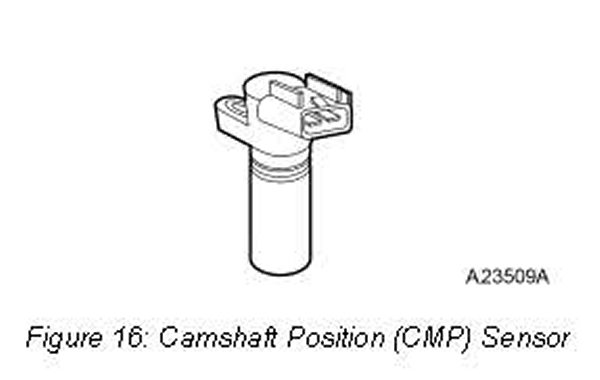 The CMP sensor is a variable reluctance sensor that detects the position of the camshaft. The CMP sensor identifies when piston number 1 is on its compression stroke. A signal is then sent to the PCM and used for synchronizing the firing of sequential fuel injectors. The PCM also uses the CMP signal to select the proper ignition coil to fire. The input circuit to the PCM is referred to as the CMP input or circuit.