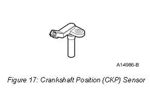 The CKP sensor is a magnetic transducer mounted on the engine block adjacent to a pulse wheel located on the crankshaft. By monitoring the crankshaft mounted pulse wheel, the CKP is the primary sensor for ignition information to the PCM. The pulse wheel has a total of 35 teeth spaced 10 degrees apart with one empty space for a missing tooth. By monitoring the pulse wheel, the CKP sensor signal indicates the crankshaft position and speed information to the PCM. By monitoring the missing tooth, the CKP sensor is also able to identify piston travel in order to synchronize the ignition system and provide a way of tracking the angular position of the crankshaft relative to a fixed reference. The PCM also uses the CKP signal to determine if a misfire has occurred by measuring rapid decelerations between pulse wheel teeth.