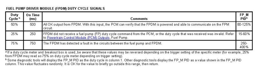 The fuel pump driver module (FPDM) communicates diagnostic information to the PCM through the FPM circuit. This information is sent by the FPDM as a duty cycle signal. The 3 duty cycle signals that may be sent are listed in the table.