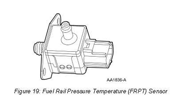 The FRPT sensor measures the pressure and temperature of the fuel in the fuel rail and sends these signals to the PCM. The sensor uses the intake manifold vacuum as a reference to sense the pressure difference between the fuel rail and the intake manifold. A fuel return line to the fuel tank is not used in this type of fuel system. The relationship between fuel pressure and fuel temperature is used to determine the possible presence of fuel vapor in the fuel rail. Both pressure and temperature signals are used to control the speed of the fuel pump. The speed of the fuel pump maintains fuel rail pressure by keeping fuel in its liquid state. The dynamic range of the fuel injectors increases because of the higher rail pressure, which allows the injector pulse width to decrease.