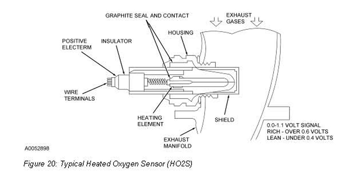 The HO2S detects the presence of oxygen in the exhaust and produces a variable voltage according to the amount of oxygen detected. A high concentration of oxygen (lean air/fuel ratio) in the exhaust produces a voltage signal less than 0.4 volt. A low concentration of oxygen (rich air/fuel ratio) produces a voltage signal greater than 0.6 volt. The HO2S provides feedback to the PCM indicating air/fuel ratio in order to achieve a near stoichiometric air/fuel ratio of 14.7:1 during closed loop engine operation. The HO2S generates a voltage between 0.0 and 1.1 volts.