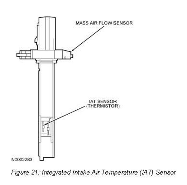 The IAT sensor is integrated into the mass air flow (MAF) sensor. It is a thermistor device in which resistance changes with temperature. The electrical resistance of a thermistor decreases as the temperature increases, and the resistance increases as the temperature decreases. The varying resistance affects the voltage drop across the sensor terminals and provides electrical signals to the PCM corresponding to temperature.