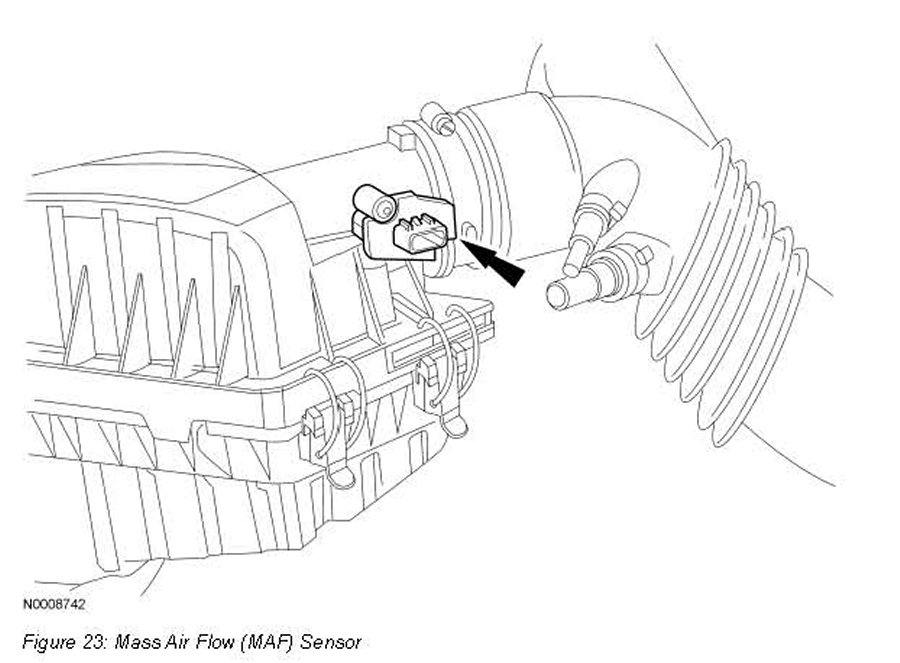 The MAF sensor uses a hot wire sensing element to measure the amount of air entering the engine. Air passing over the hot wire causes it to cool. This hot wire is maintained at 200°C (392°F) above the ambient temperature as measured by a constant cold wire. If the hot wire electronic sensing element must be replaced, then the entire assembly must be replaced. Replacing only the element may change the air flow calibration.