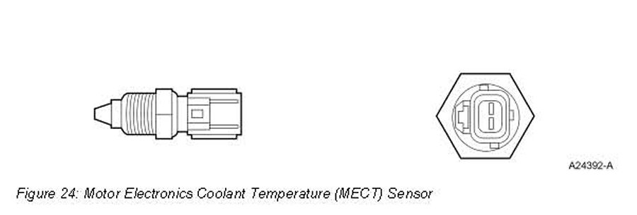 The MECT sensor is a thermistor device in which resistance changes with temperature. The electrical resistance of a thermistor decreases as the temperature increases, and the resistance increases as the temperature decreases. The varying resistance affects the voltage drop across the sensor terminals and provides electrical signals to the PCM corresponding to temperature. A thermistor-type sensor is considered a passive sensor. A passive sensor is connected to a voltage divider network so that varying the resistance of the passive sensor causes a variation in total current flow. Voltage that is dropped across a fixed resistor in a series with the sensor resistor determines the voltage signal at the PCM. This voltage signal is equal to the reference voltage minus the voltage drop across the fixed resistor. The MECT provides motor electronics coolant system temperature information to the PCM. The PCM uses this information for determining when to activate the cooling system fans and indicate over-temperature.