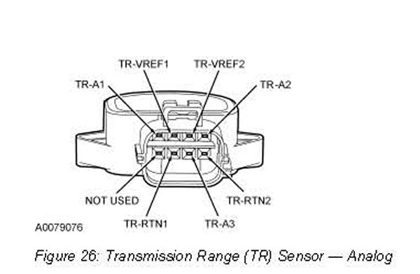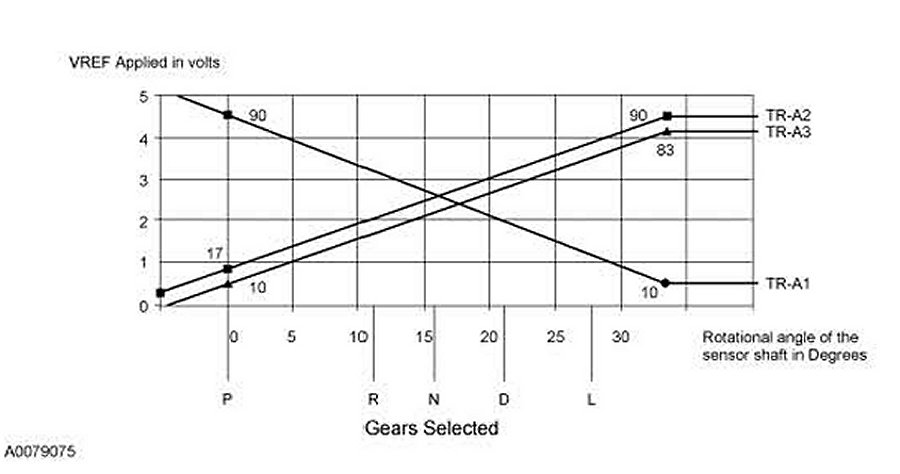 The TR-A1 signal has a negative voltage slope, meaning the voltage decreases when the sensor angle increases. The typical TR voltage ranges from approximately 4.5 volts in the PARK position to approximately 1 volt in the LOW gear position. The TR-A2 and the TR-A3 signals both have a positive voltage slope. Voltages increase as the sensor angle increases. The typical voltage for the TR-A2 and the TR-A3 range from about 0.6 volts in the PARK position to about 3.5 volts in the LOW gear position.