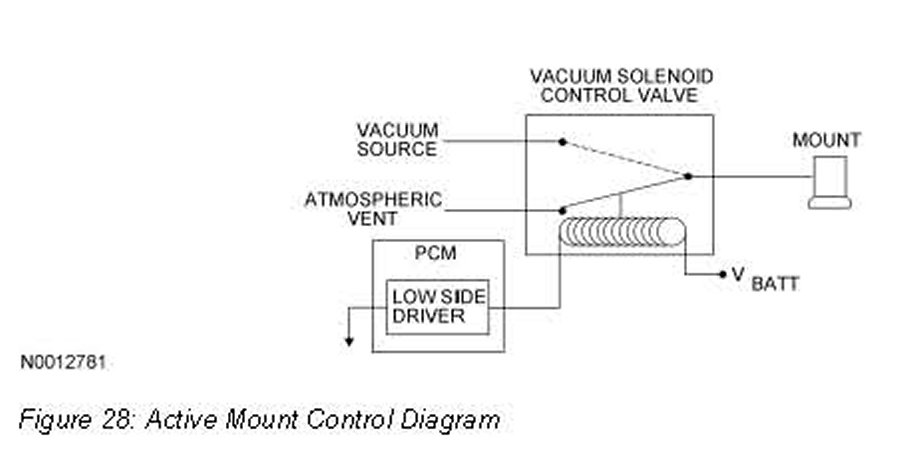 The Escape Hybrid is equipped with a semi-active vacuum operated electronically controlled engine mount. The semi-active mount is located on the bulkhead side of the engine. The semi-active mount has 2 fluid filled chambers with a variable orifice between both chambers. This mount changes state based on the engine speed that is calibrated in the PCM. When the engine RPM is at or below a calibrated value vacuum is applied to the mount which increases the size of the orifice making the mount softer. When the engine RPM is greater than the calibrated engine RPM the vacuum supply is closed and the vacuum in the mount is bled to atmospheric pressure which decreases the size of the orifice making the mount firmer.