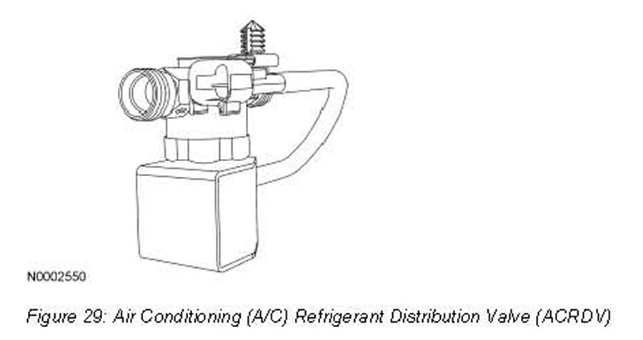 The ACRDV is a PCM controlled solenoid which provides a regulated control of refrigerant flow to the passenger compartment loop. The PCM opens or closes the ACRDV based on the passenger compartment A/C request. The ACRDV is a normally closed valve, preventing the refrigerant flow. When the passenger compartment A/C is requested ON, the PCM provides a ground path to the solenoid which opens the ACRDV.