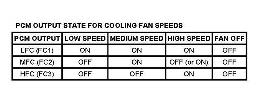 For 3-speed fans, although the PCM output circuits are called low, medium, and high fan control (FC), cooling fan speed is controlled by a combination of these outputs. Refer to the table.