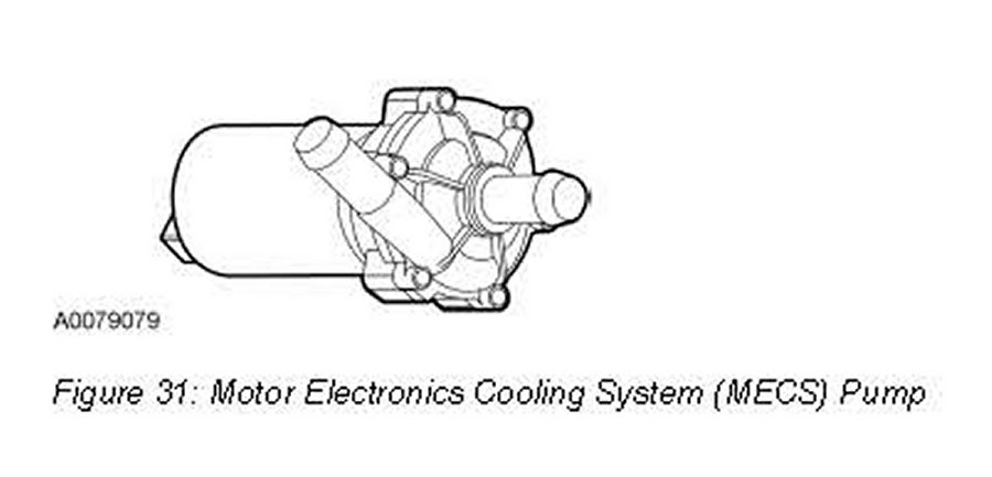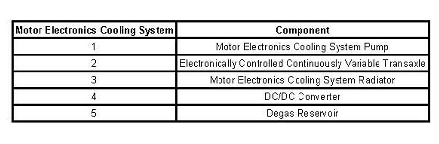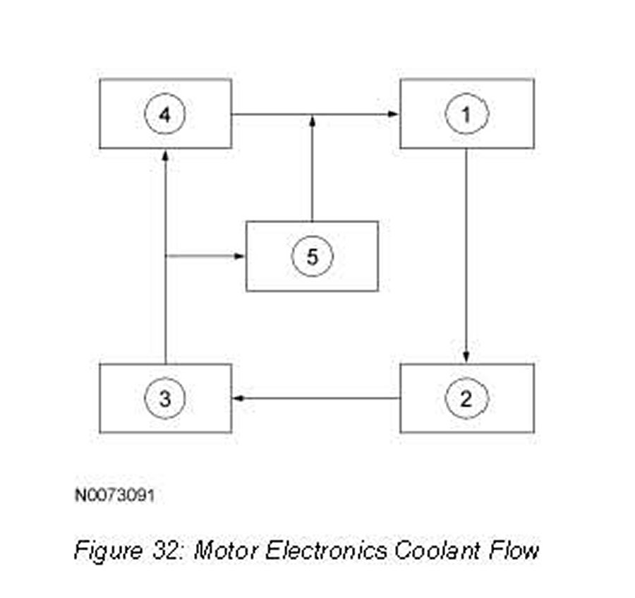 The motor electronics cooling system is required to maintain an acceptable temperature for the transaxle and the DC/DC converter. The system temperature is monitored by the motor electronics coolant temperature (MECT) sensor, which is an input to the PCM. The PCM commands the MECS pump using the MECS pump relay. The MECS pump is commanded on whenever the traction battery contactors are closed. The coolant in the system flows in a loop from the MECS pump, to the transaxle, then into the MECS radiator bottom hose port, out of the top hose port of the MECS radiator, into the DC/DC converter, and back into the MECS pump. The cooling system has a degassing system that is connected in parallel between the MECS radiator and the MECS pump. The degassing system bleeds air/gases into the degas reservoir.