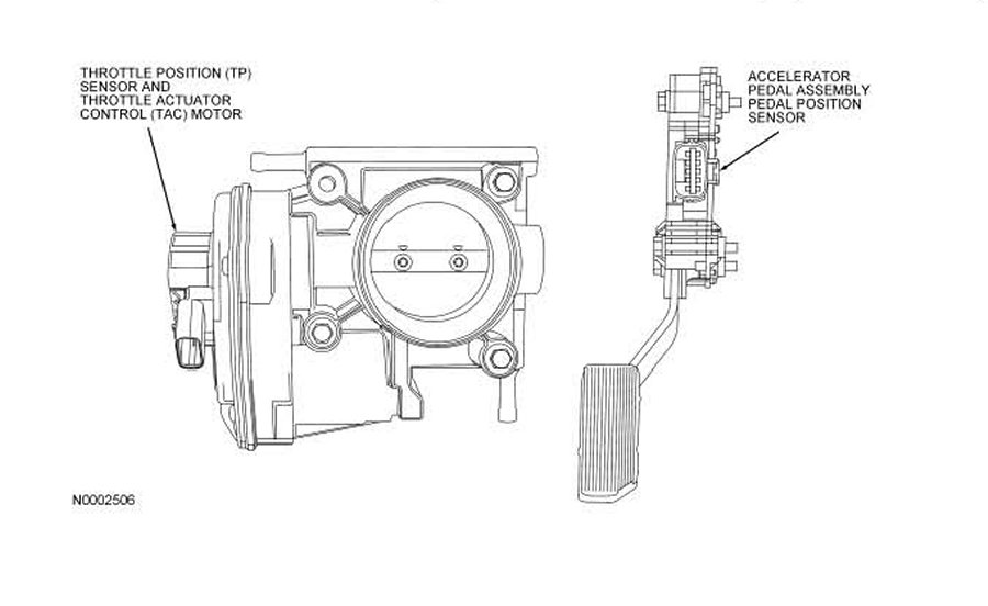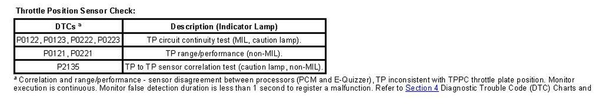 5. The system has 2 throttle position sensors. Redundant throttle position signals are required for monitor reasons. The TP1 has a negative slope (increasing angle, decreasing voltage) and the TP2 has a positive slope (increasing angle, increasing voltage). During normal operation the negative sloped TP sensor (TP1) is used by the control strategy as the indication of the throttle position. The TP sensor assembly requires 4 wires: