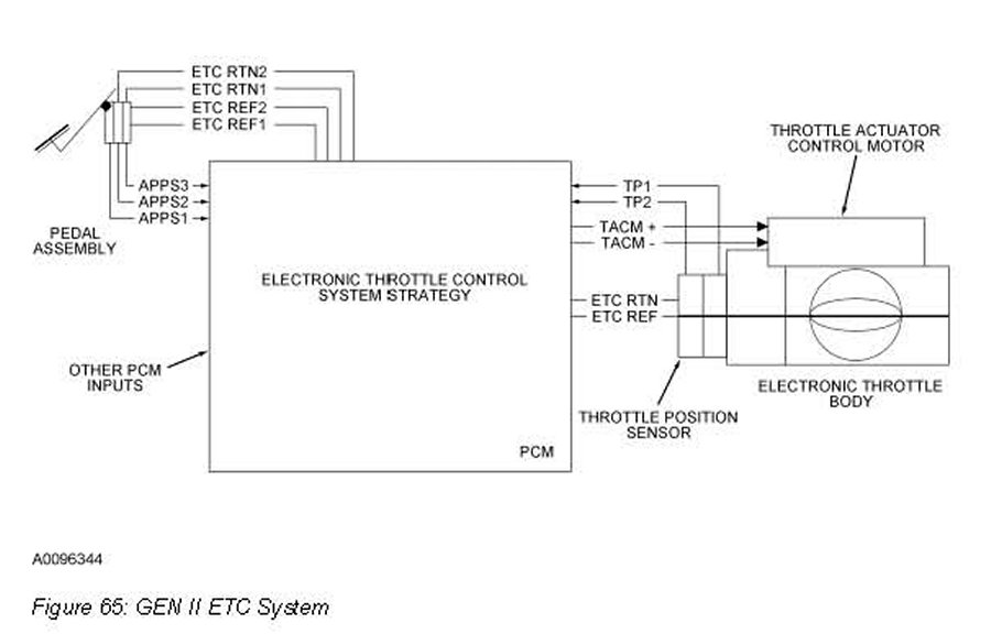 The Generation II (Gen II) torque based electronic throttle control (ETC) is a hardware and software strategy that delivers an engine output torque (through throttle angle) based on driver demand (pedal position). It uses an electronic throttle body, the PCM, and an accelerator pedal assembly to the control throttle opening and engine torque. The ETC system basically replaces the standard cable operated accelerator pedal, idle air control (IAC) valve, 3-wire throttle position (TP) sensor, and mechanical throttle body.