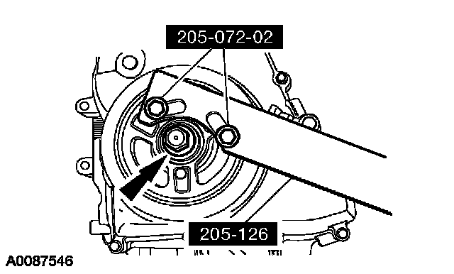 CAUTION: Failure to hold the crankshaft pulley in place during bolt tightening can cause damage to the engine front cover.