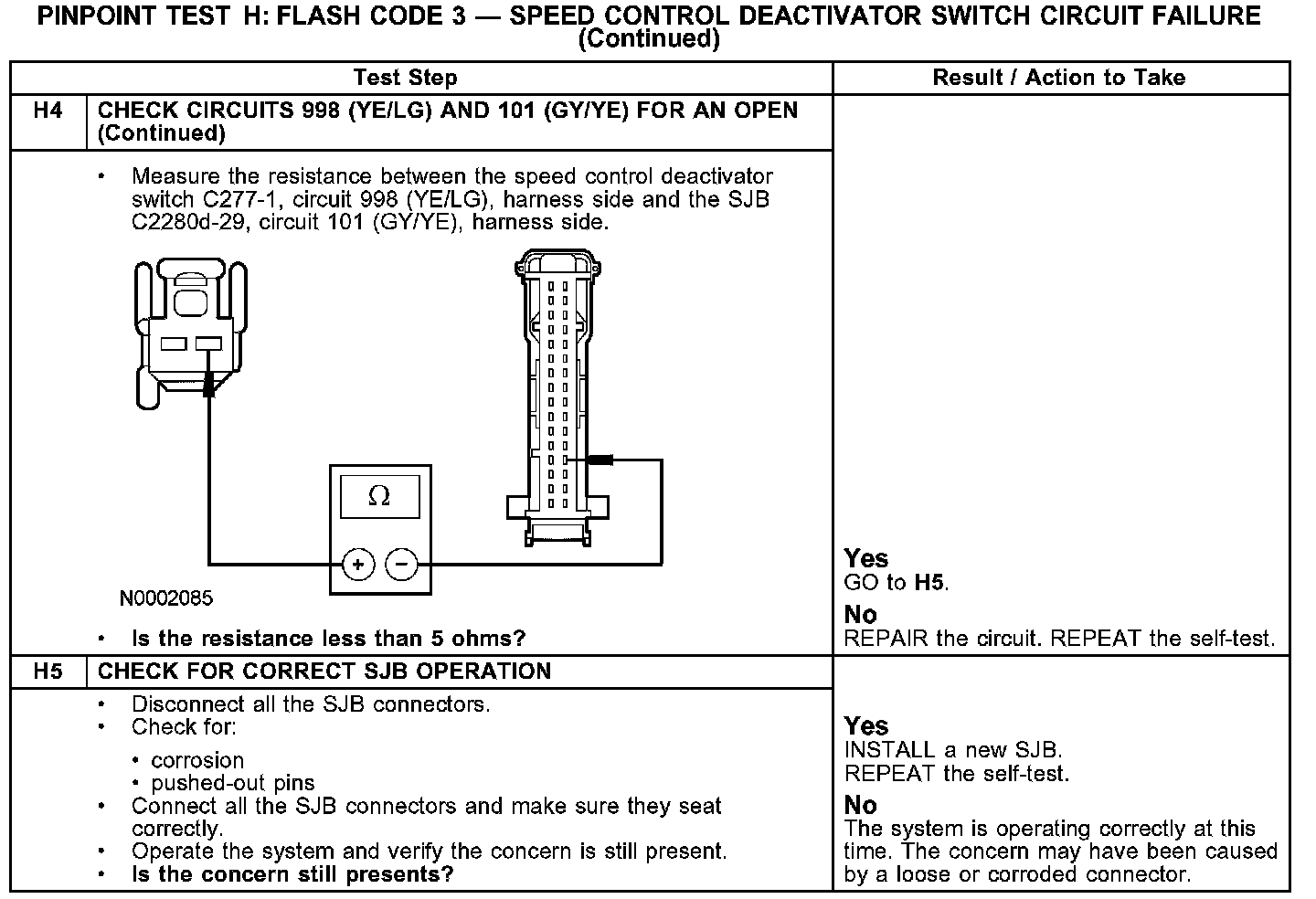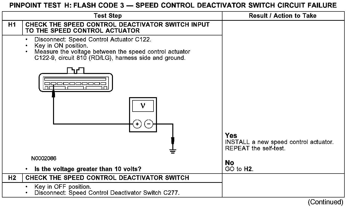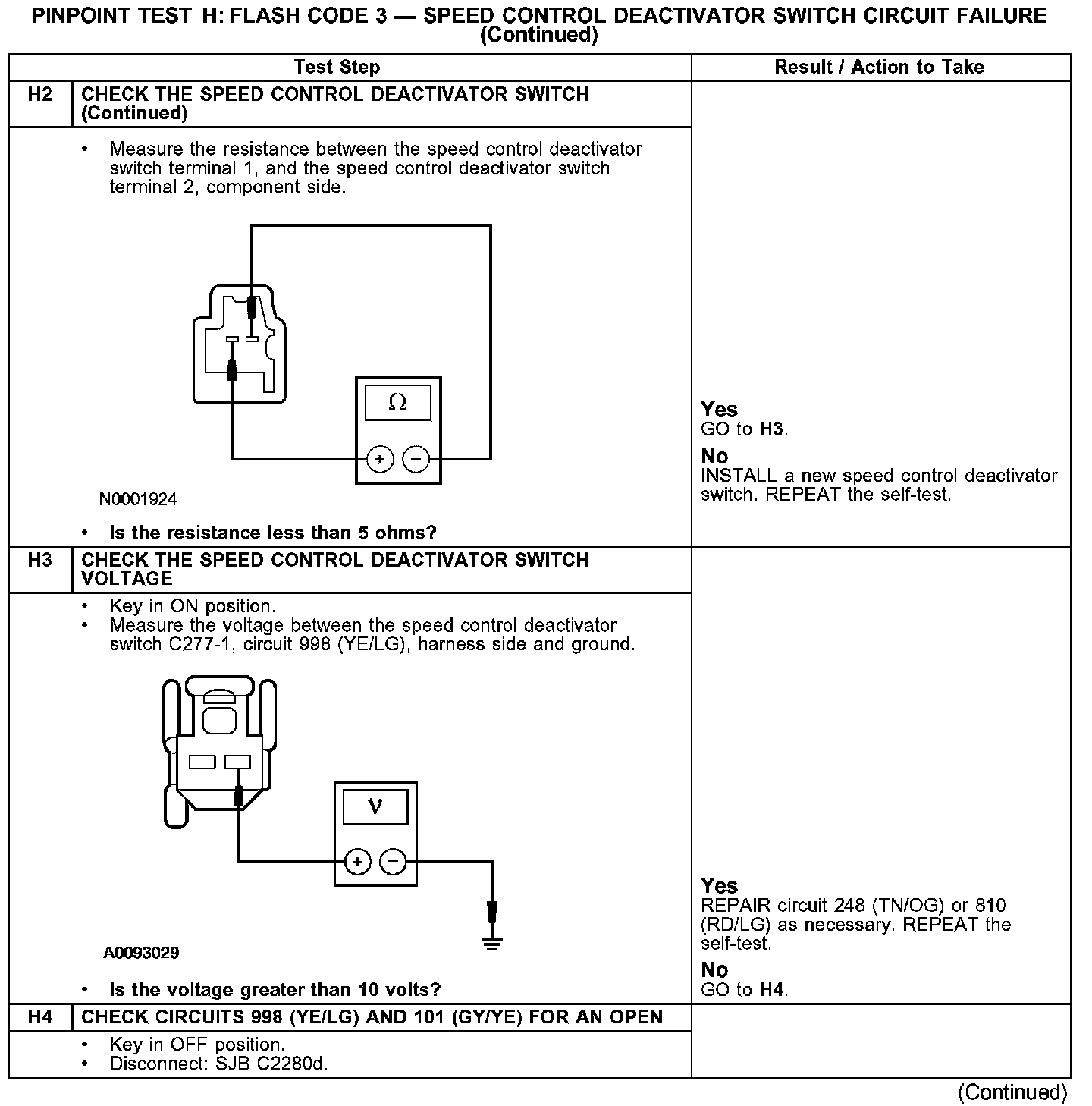 PINPOINT TEST H: FLASH CODE 3 - SPEED CONTROL DEACTIVATOR SWITCH CIRCUIT FAILUREH1-H2: