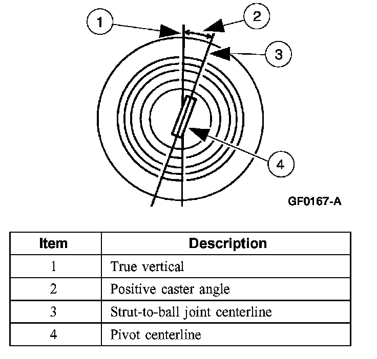 Caster is the deviation from vertical of an imaginary line drawn through the pivot points (top of strut and lower ball joint), when viewed from the side. The caster specifications will give the vehicle the best directional stability characteristics when loaded and driven. The caster setting is not related to tire wear.