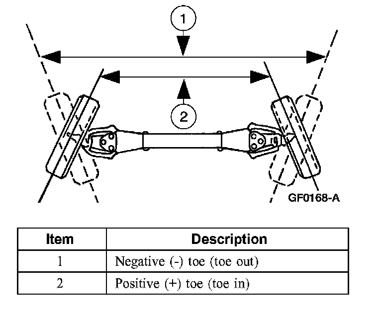 When the wheels are turned in toward the front of the vehicle, the toe is positive (+) (toe in). When the wheels are turned out toward the front of the vehicle, the toe is negative (-) (toe out). This is measured in degrees, from side-to-side, and totalled.