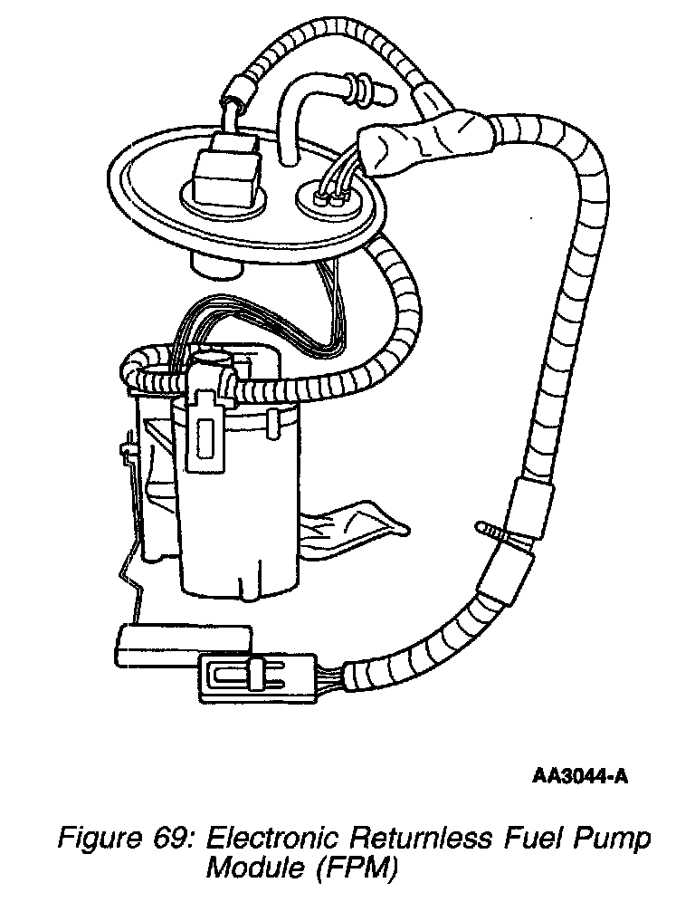 The fuel pump (FP) module is a device that contains the fuel pump and sender assembly. The fuel pump is located inside the FP module reservoir and supplies fuel through the FP module manifold to the engine and FP module jet pump. The jet pump continuously refills the reservoir with fuel, and a check valve located in the manifold outlet maintains system pressure when the fuel pump is not energized. A flapper valve located in the bottom of the reservoir allows fuel to enter the reservoir and prime the fuel pump during the initial fill.
