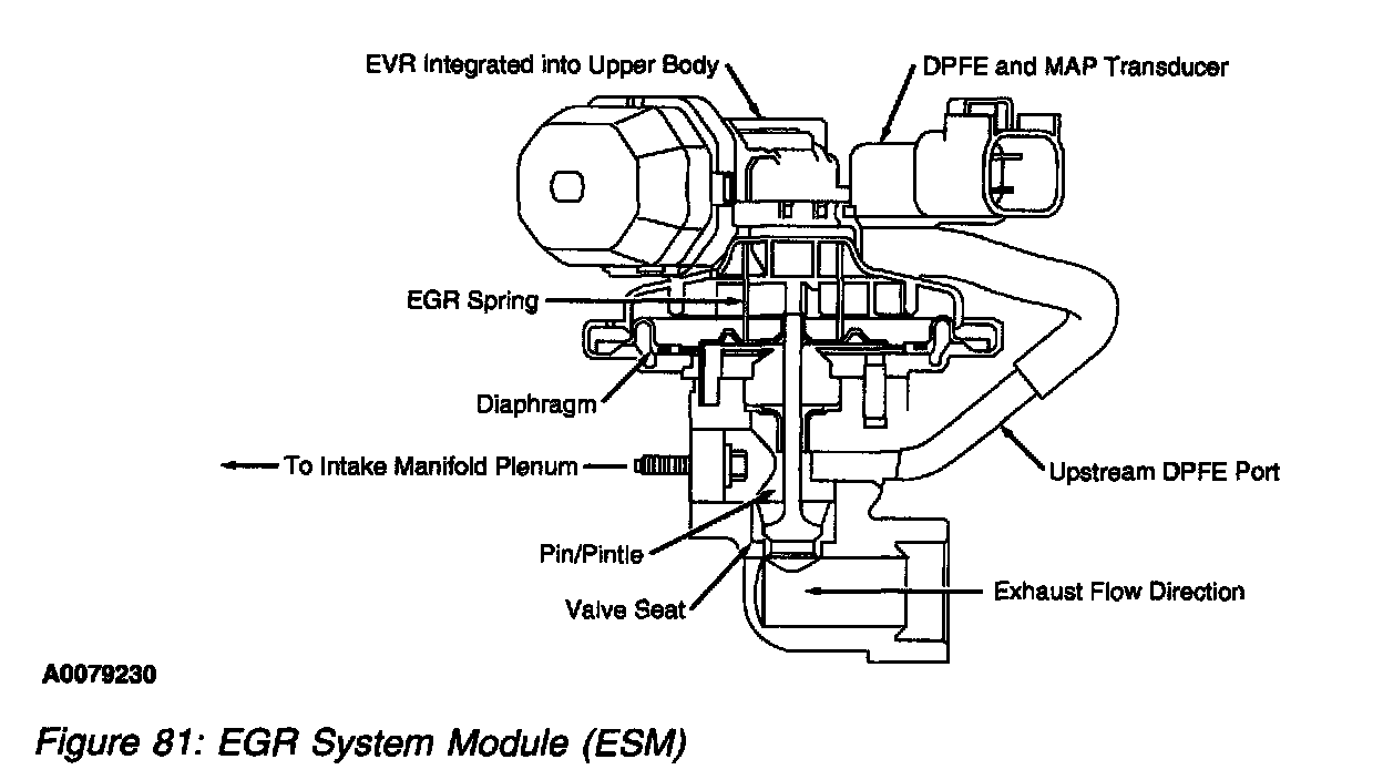 The ESM is an updated DPFE EGR system. It functions in the same manner as the conventional DPFE system, however the various system components have been integrated into a single component called the ESM. The flange of the valve portion of the ESM bolts directly to the intake manifold with a metal gasket that forms the measuring orifice. This arrangement increases system reliability, response time, and system precision. By relocating the EGR orifice from the exhaust to the intake side of the EGR valve, the downstream pressure signal measures manifold absolute pressure (MAP). The system provides the PCM with a differential DPFE signal, identical to a traditional DPFE system.