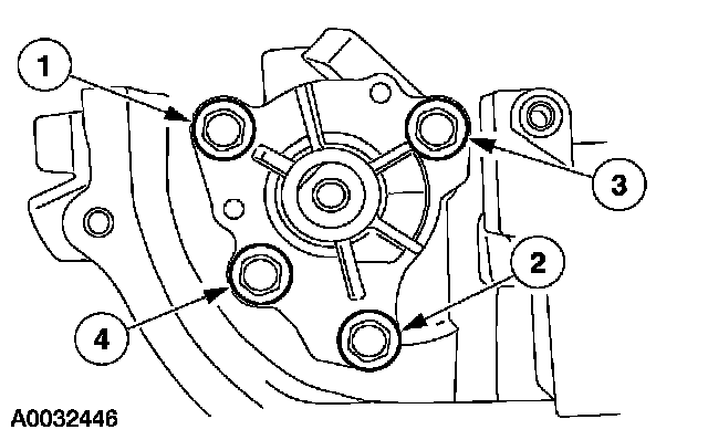 Install the oil pump assembly. Tighten the bolts in the sequence shown in 2 stages: