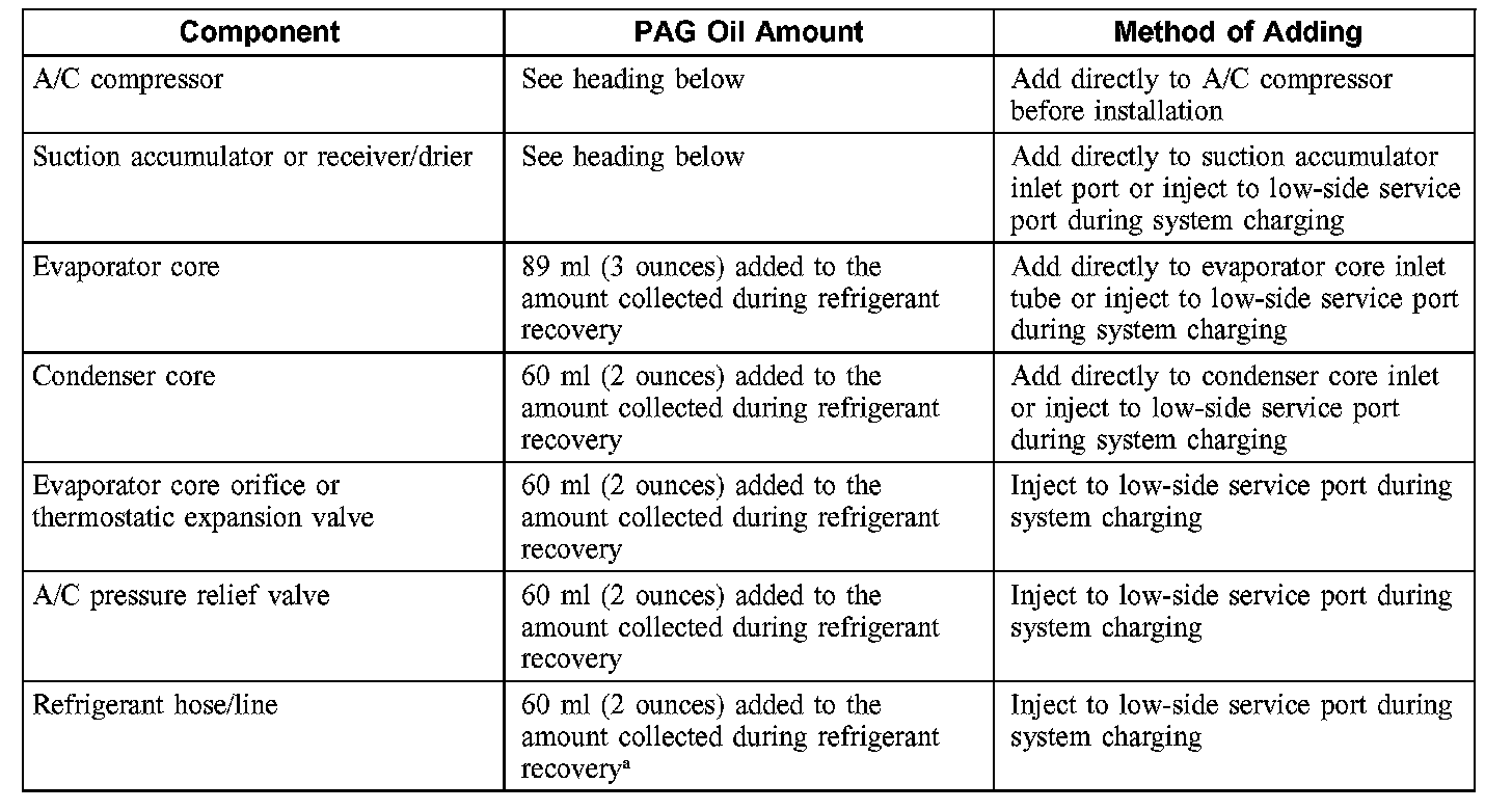 CAUTION: During normal A/C operation, oil is circulated through the system with the refrigerant, and a small amount is retained in each component. If certain components of the system are removed, some of the refrigerant oil will go with the component. To maintain the original total oil charge, it is necessary to compensate for the oil lost by adding oil to the system with the new part.