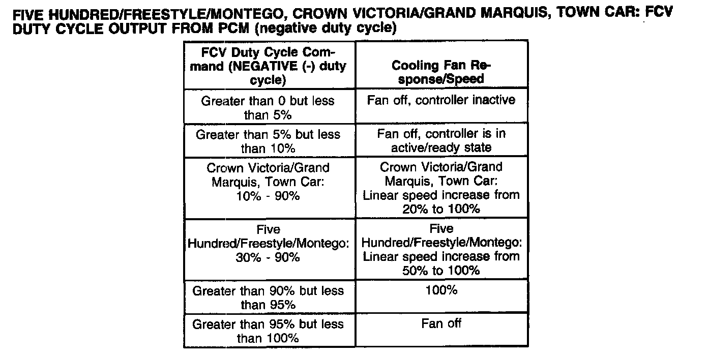 Five Hundred/Freestyle/Montego, Crown Victoria/Grand Marquis, Town Car: FCV Duty Cycle Output From PCM (negative Duty Cycle):