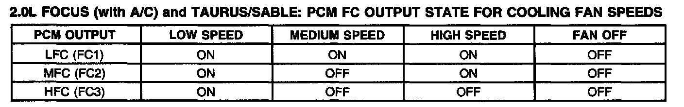 2.0L Focus (with A/C) And Taurus/Sable: PCM FC Output State For Cooling Fan Speeds Chart: