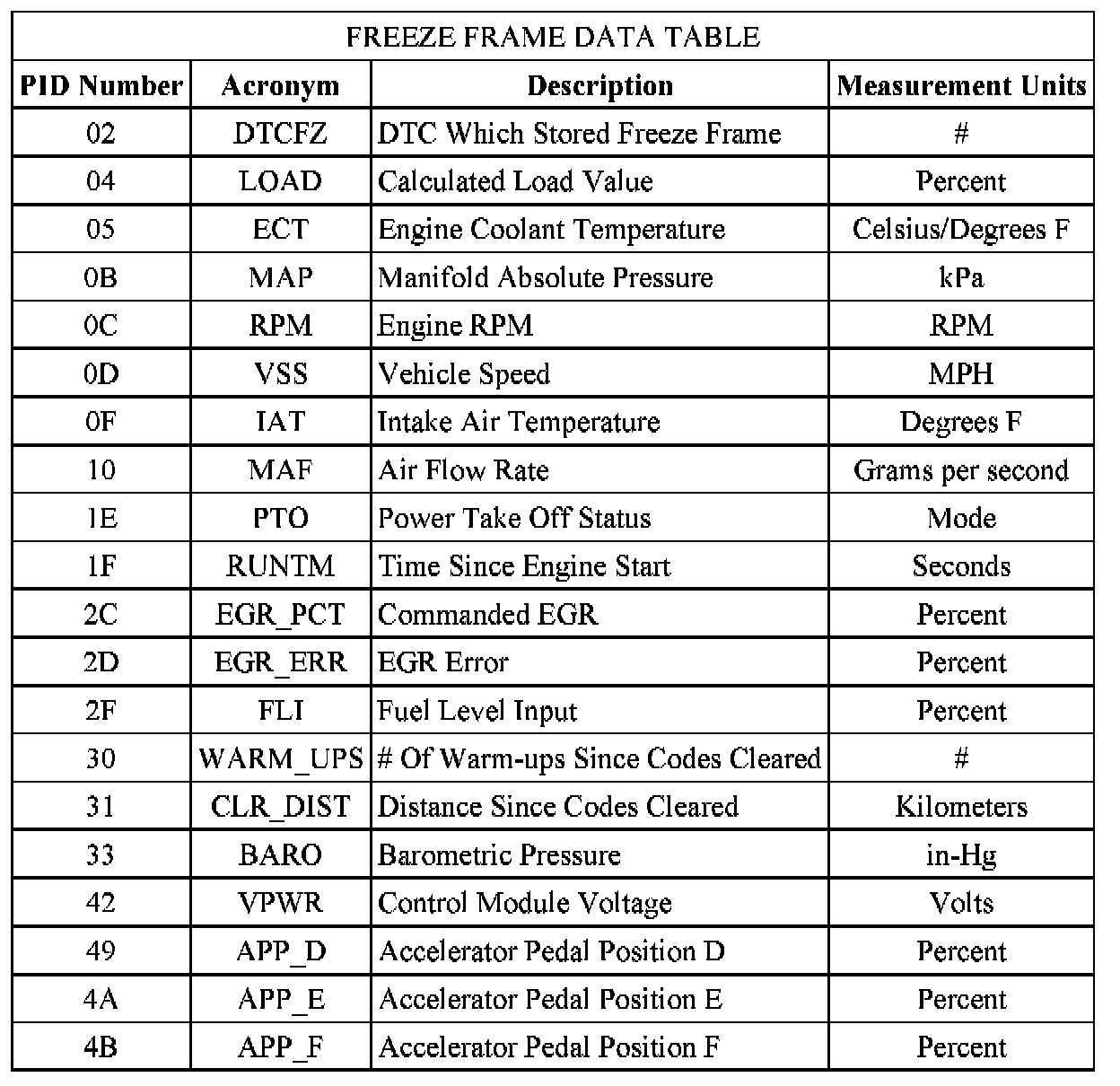 Freeze frame data allows access to emission related values from specific generic parameter identification (PIDs). These values are stored the instant an emission related diagnostic trouble code (DTC) is stored in continuous memory. This provides a snapshot of the conditions that were present when the DTC was stored. Once one set of freeze frame data is stored this data remains in memory even if another emission related DTC is stored. When a DTC associated with the freeze frame is erased or a keep alive memory (KAM) reset is carried out new freeze frame data can be stored. In the event of multiple emission related DTCs in memory always note the DTC for the freeze frame data.