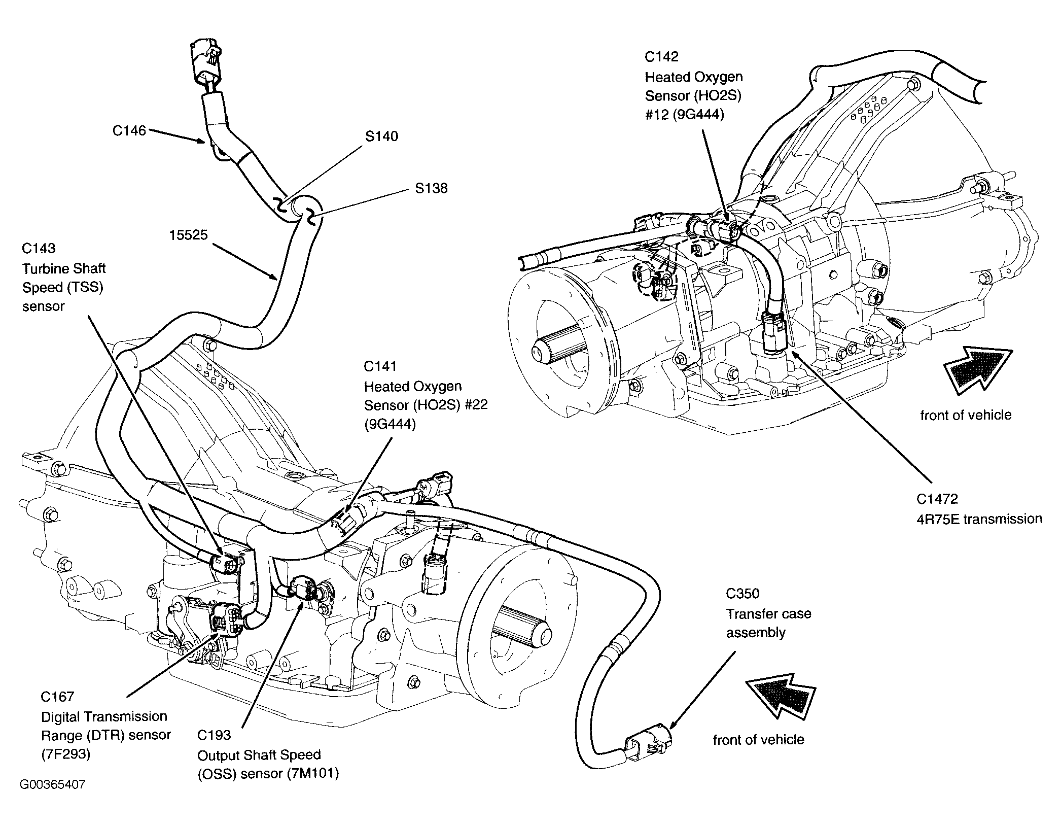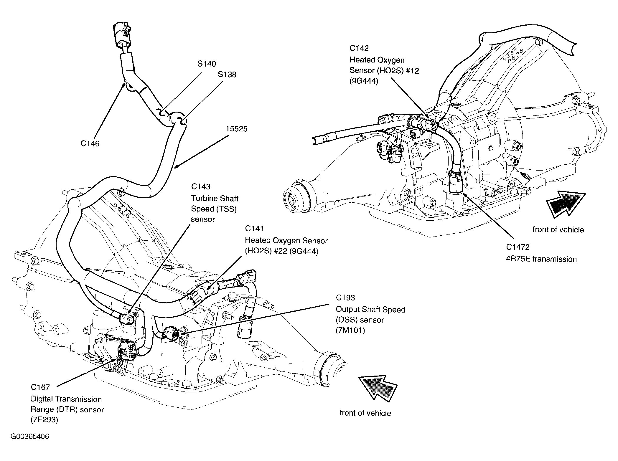 | S140 (4R75E W/O 4WD) | In back-up lamp switch to rear lamp feed harness, near breakout to right side of firewall. See Figure. |